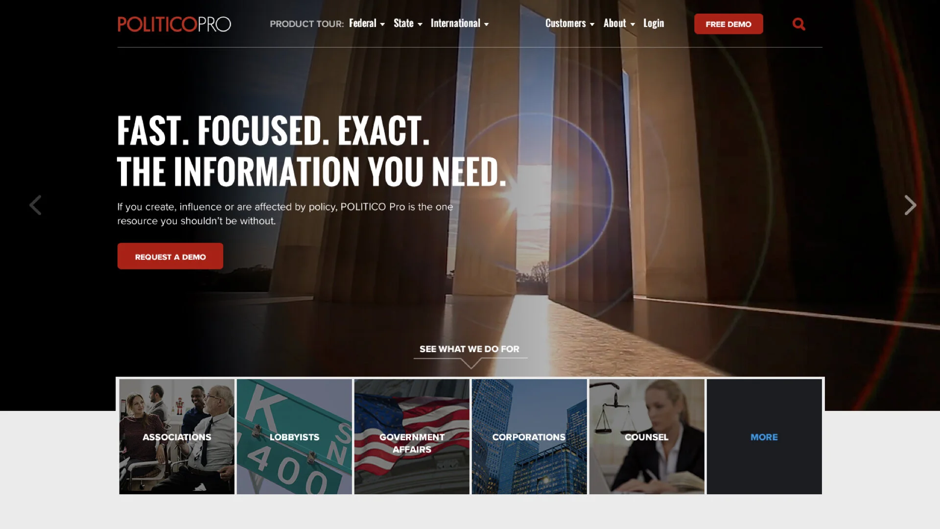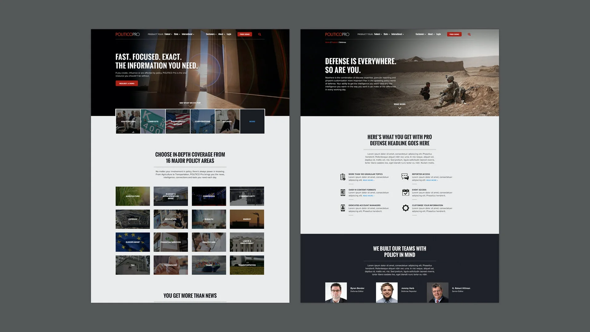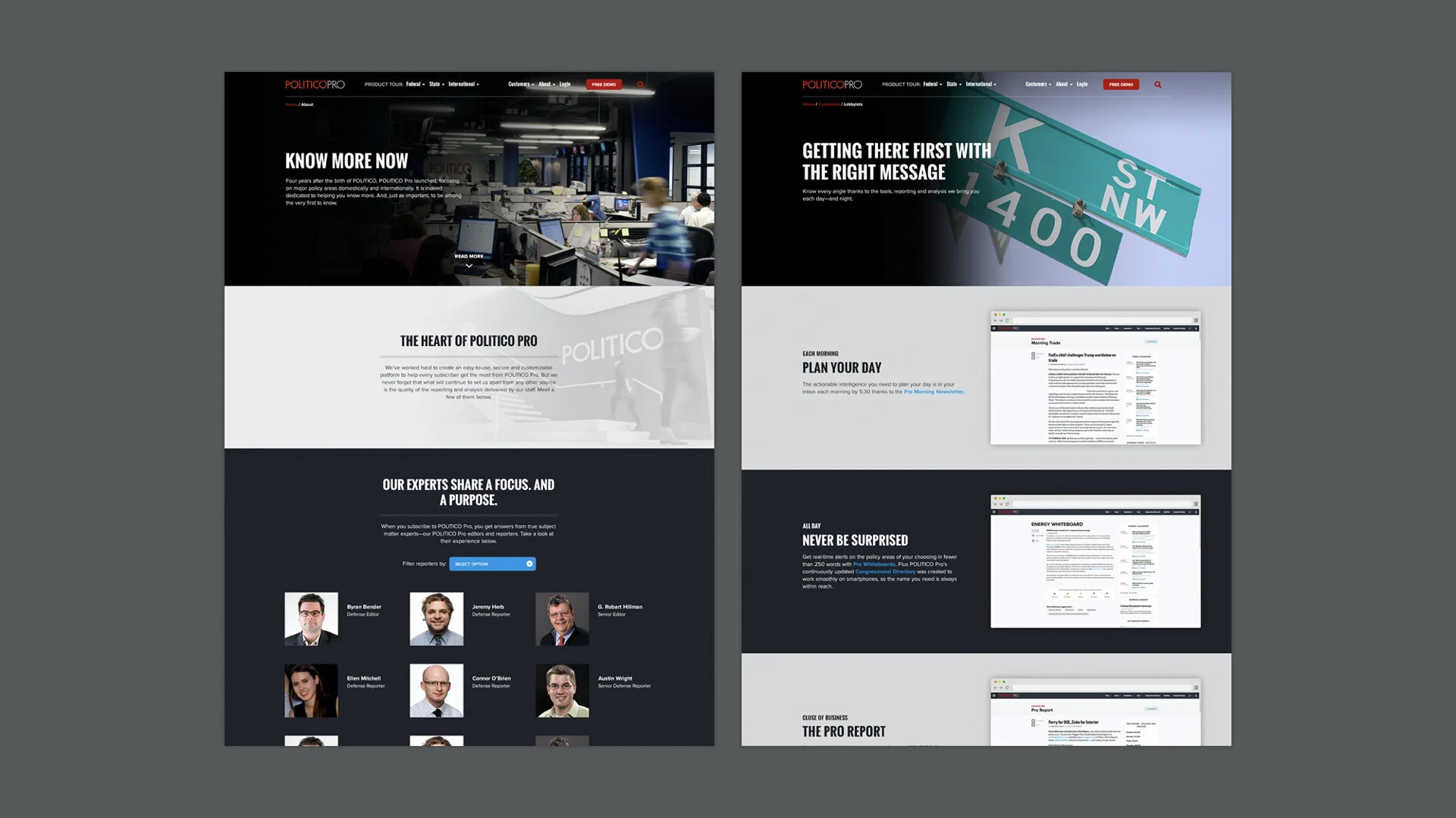 While policy professionals on the Hill and within corporations and communications firms—to name just a few—read POLITICO daily, few understood the value of a customized POLITICO Pro subscription. Timely information and nuanced insight, delivered throughout the day precisely the way the user wants it, means POLITICO Pro is more than a source, it’s a valuable resource for anyone who creates, effects, or is influenced by policy. Our challenge was to produce one marketing site that could quickly and compellingly address the needs of several audiences.